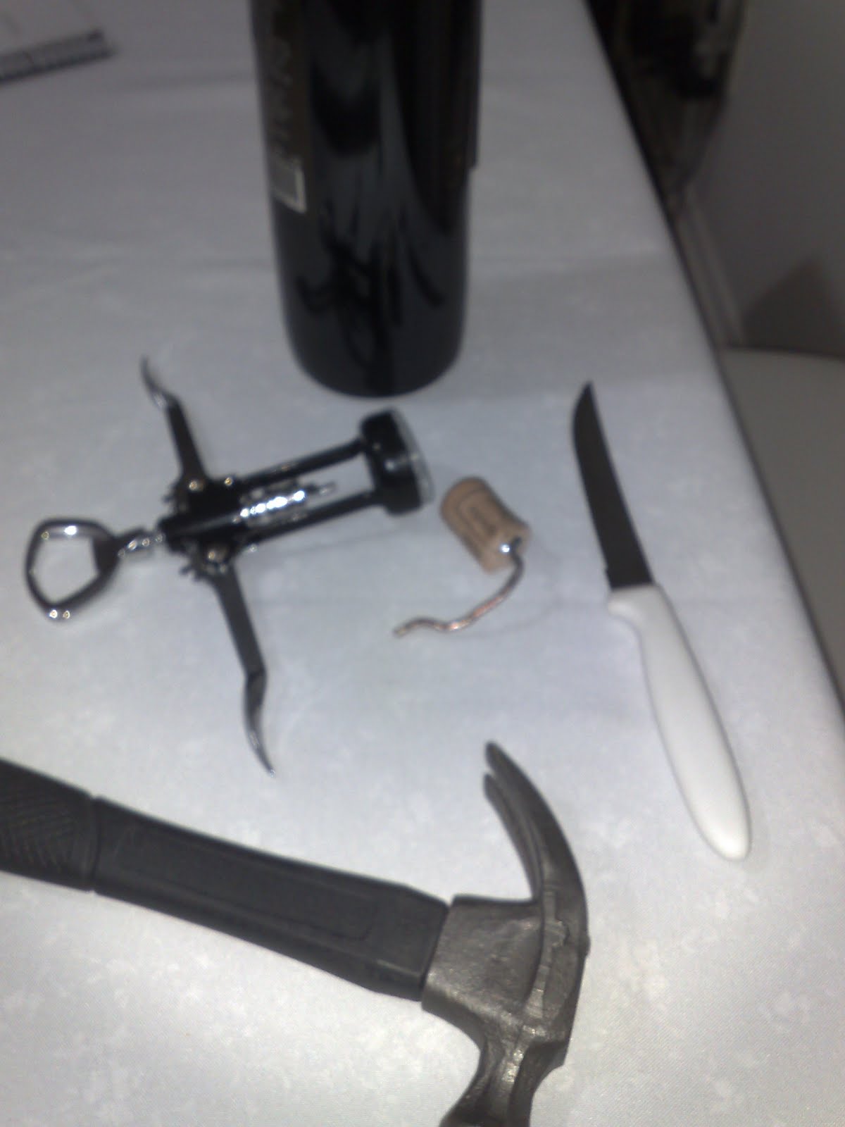 Até que tenho idéia de cortar a rolha para ir diminuindo seu tamanho... Acho que passei pelo menos 30 minutos tentando abrir a garrafa...